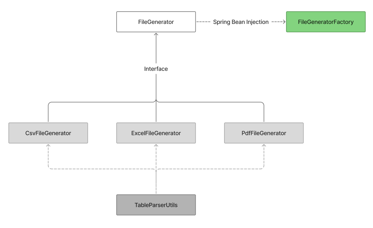 @Component public class ExcelFileGenerator implements FileGenerator { ... } @Component public class CsvFileGenerator implements FileGenerator { ... }이 두 클래스는 모두