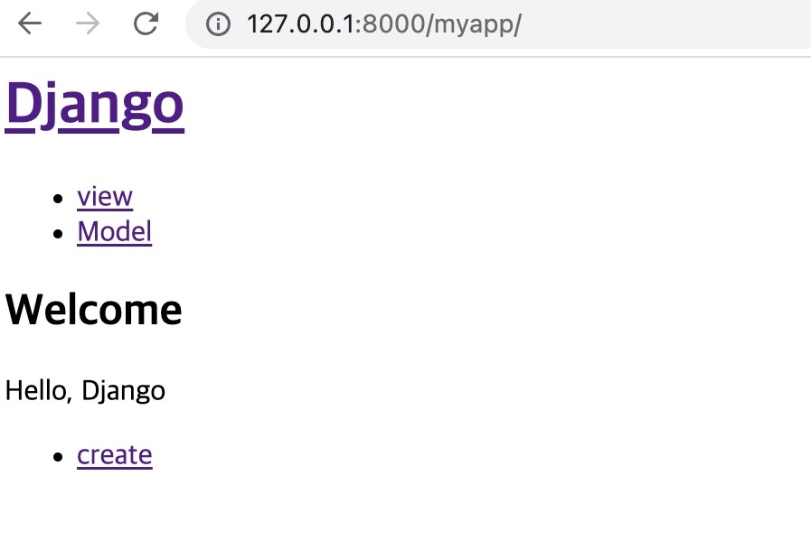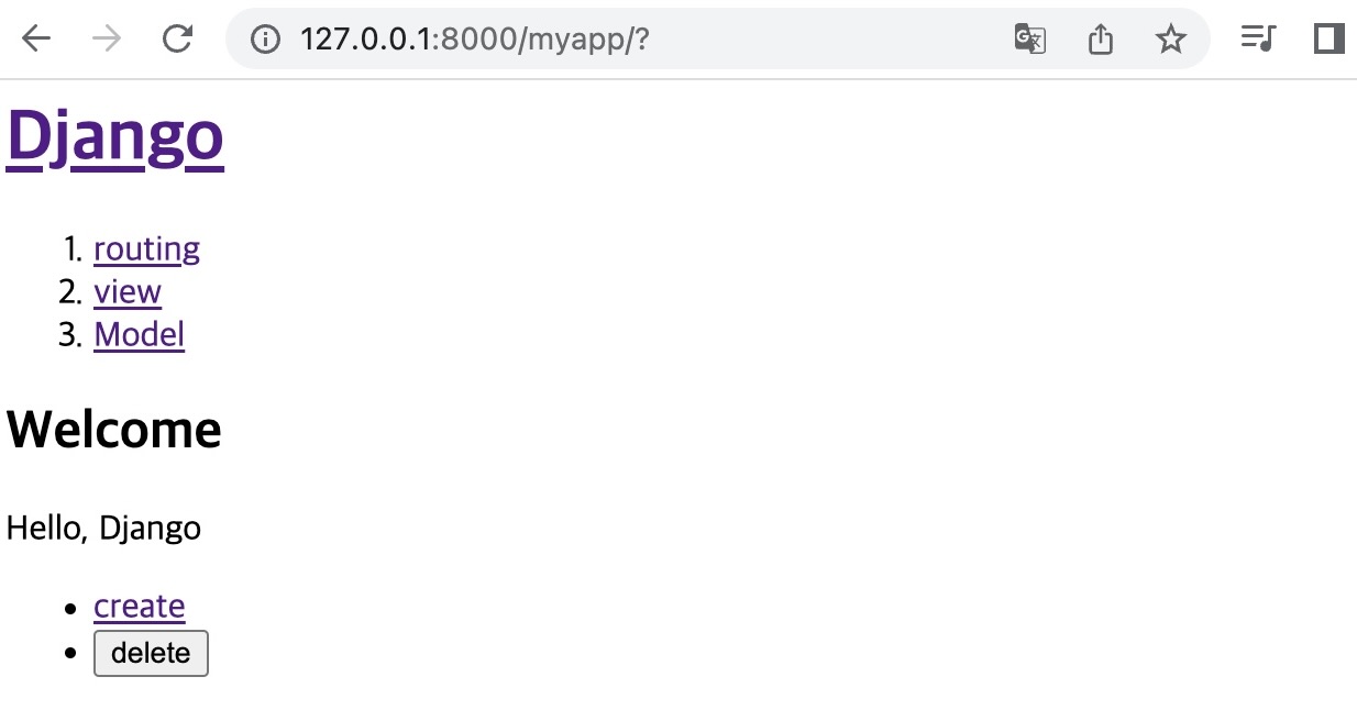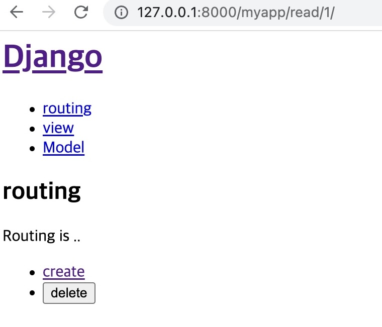 def HTMLTemplate(articleTag): global topics ol = '' for topic in topics: ol += f'<li><a href="read/{topic["id"]}">{topic["title"]}</a></li>' return f''' <html> <body> <h1><a href="/myapp">Django</a></h1> <ol> {ol} </ol> {articleTag} <ul> <li><a href="/myapp/create/">create</a></li> <li> <form> <input type="submit" value="delete"> </form> </li> </ul> </body> </html> '''아래와 같이 버튼이 추가된것을 확인할 수 있습니다.
