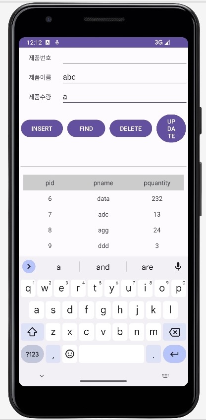 fun insertProduct(product: Product):Boolean{ val values = ContentValues() values.put(PNAME,product.pName) values.put(PQUANTITY,product.pQuantity) val db=writableDatabase val flag = db.insert(TABLE_NAME,null,values)>0 db.close() return flag }insertProduct 함수 내부에서 ContentValues에 수량을 넣을 때 put 메서드를 사용하여 PQUANTITY 컬럼에 값을 저장할 때 발생합니다. 해당 컬럼은 integer 타입으로 정의되어 있기 때문에 숫자 외의 값을 넣으면 오류가 발생하고 앱이 강제로 종료됩니다.