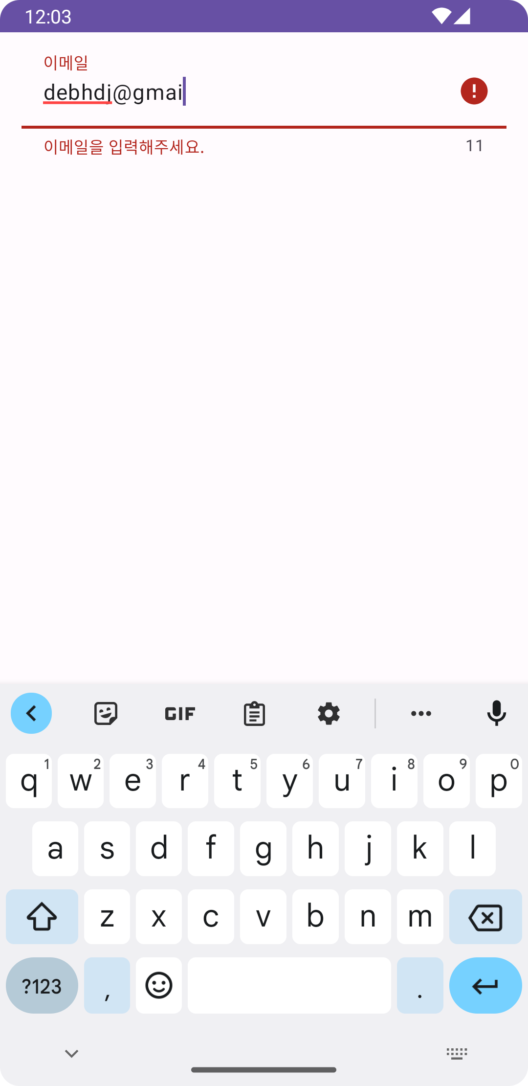 <?xml version="1.0" encoding="utf-8"?> <androidx.constraintlayout.widget.ConstraintLayout xmlns:android="http://schemas.android.com/apk/res/android" xmlns:app="http://schemas.android.com/apk/res-auto" xmlns:tools="http://schemas.android.com/tools" android:layout_width="match_parent" android:layout_height="match_parent" android:padding="16dp" tools:context=".MainActivity"> <com.google.android.material.textfield.TextInputLayout android:layout_width="match_parent" android:layout_height="wrap_content" app:boxBackgroundMode="filled" app:boxBackgroundColor="@null" app:layout_constraintTop_toTopOf="parent" app:layout_constraintStart_toStartOf="parent" app:layout_constraintEnd_toEndOf="parent"> <com.google.android.material.textfield.TextInputEditText android:layout_width="match_parent" android:layout_height="wrap_content" android:hint="이메일" /> </com.google.android.material.textfield.TextInputLayout> </androidx.constraintlayout.widget.ConstraintLayout>기본적으로 TextInputLayout을 사용하는 코드입니다.