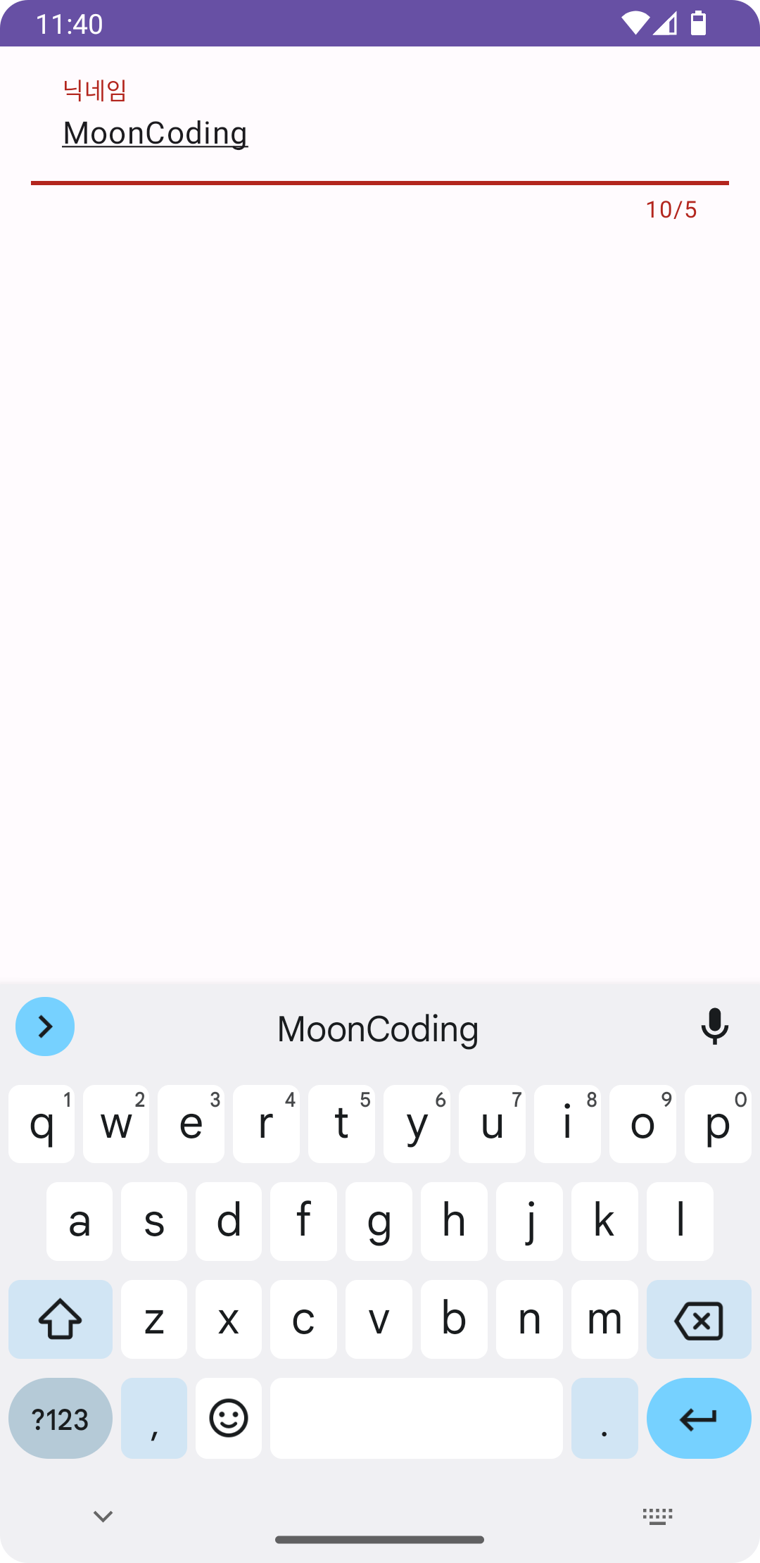 <?xml version="1.0" encoding="utf-8"?> <androidx.constraintlayout.widget.ConstraintLayout xmlns:android="http://schemas.android.com/apk/res/android" xmlns:app="http://schemas.android.com/apk/res-auto" xmlns:tools="http://schemas.android.com/tools" android:layout_width="match_parent" android:layout_height="match_parent" android:padding="16dp" tools:context=".MainActivity"> <com.google.android.material.textfield.TextInputLayout android:layout_width="match_parent" android:layout_height="wrap_content" app:counterMaxLength="5" app:counterEnabled="true" app:boxBackgroundMode="filled" app:boxBackgroundColor="@null" app:layout_constraintTop_toTopOf="parent" app:layout_constraintStart_toStartOf="parent" app:layout_constraintEnd_toEndOf="parent"> <com.google.android.material.textfield.TextInputEditText android:layout_width="match_parent" android:layout_height="wrap_content" android:hint="닉네임" /> </com.google.android.material.textfield.TextInputLayout> </androidx.constraintlayout.widget.ConstraintLayout>