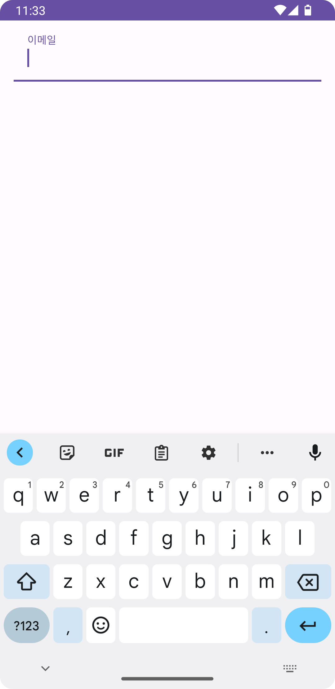 <?xml version="1.0" encoding="utf-8"?> <androidx.constraintlayout.widget.ConstraintLayout xmlns:android="http://schemas.android.com/apk/res/android" xmlns:app="http://schemas.android.com/apk/res-auto" xmlns:tools="http://schemas.android.com/tools" android:layout_width="match_parent" android:layout_height="match_parent" android:padding="16dp" tools:context=".MainActivity"> <com.google.android.material.textfield.TextInputLayout android:layout_width="match_parent" android:layout_height="wrap_content" app:boxBackgroundMode="filled" app:boxBackgroundColor="@null" app:layout_constraintTop_toTopOf="parent" app:layout_constraintStart_toStartOf="parent" app:layout_constraintEnd_toEndOf="parent"> <com.google.android.material.textfield.TextInputEditText android:layout_width="match_parent" android:layout_height="wrap_content" android:hint="이메일" /> </com.google.android.material.textfield.TextInputLayout> </androidx.constraintlayout.widget.ConstraintLayout>기본적으로 TextInputLayout을 사용하는 코드입니다.