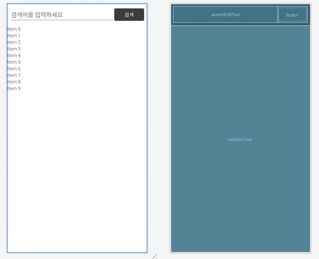 <?xml version="1.0" encoding="utf-8"?> <LinearLayout xmlns:android="http://schemas.android.com/apk/res/android" xmlns:tools="http://schemas.android.com/tools" android:layout_width="match_parent" android:layout_height="match_parent" android:orientation="vertical" xmlns:app="http://schemas.android.com/apk/res-auto" tools:context=".MainFragment"> <LinearLayout android:layout_width="match_parent" android:layout_height="wrap_content" android:orientation="horizontal" android:padding="8dp"> <EditText android:id="@+id/searchEditText_2" android:layout_width="0dp" android:layout_height="match_parent" android:layout_weight="1" android:hint="검색어를 입력하세요!" tools:ignore="DuplicateIds" /> <Button android:id="@+id/searchButton_2" android:layout_width="wrap_content" android:layout_height="wrap_content" android:text="검색" android:backgroundTint="@color/space_gray"/> </LinearLayout> <androidx.swiperefreshlayout.widget.SwipeRefreshLayout android:id="@+id/swipe_2" android:layout_width="match_parent" android:layout_height="0dp" android:layout_weight="1"> <androidx.recyclerview.widget.RecyclerView android:id="@+id/recyclerView" android:layout_width="match_parent" android:layout_height="match_parent" android:layout_marginStart="8dp" android:layout_marginTop="8dp" android:layout_marginEnd="8dp" android:layout_marginBottom="8dp" /> </androidx.swiperefreshlayout.widget.SwipeRefreshLayout> </LinearLayout>