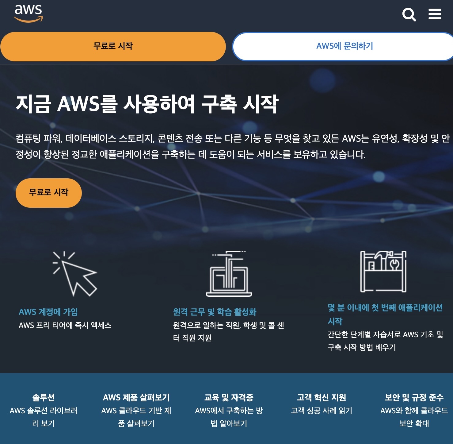 해당 홈페이지에서는 계정 생성 뿐만 아니라, 자습서와 AWS 프리 티어에 대한 설명 및 링크를 제공하고 있다.