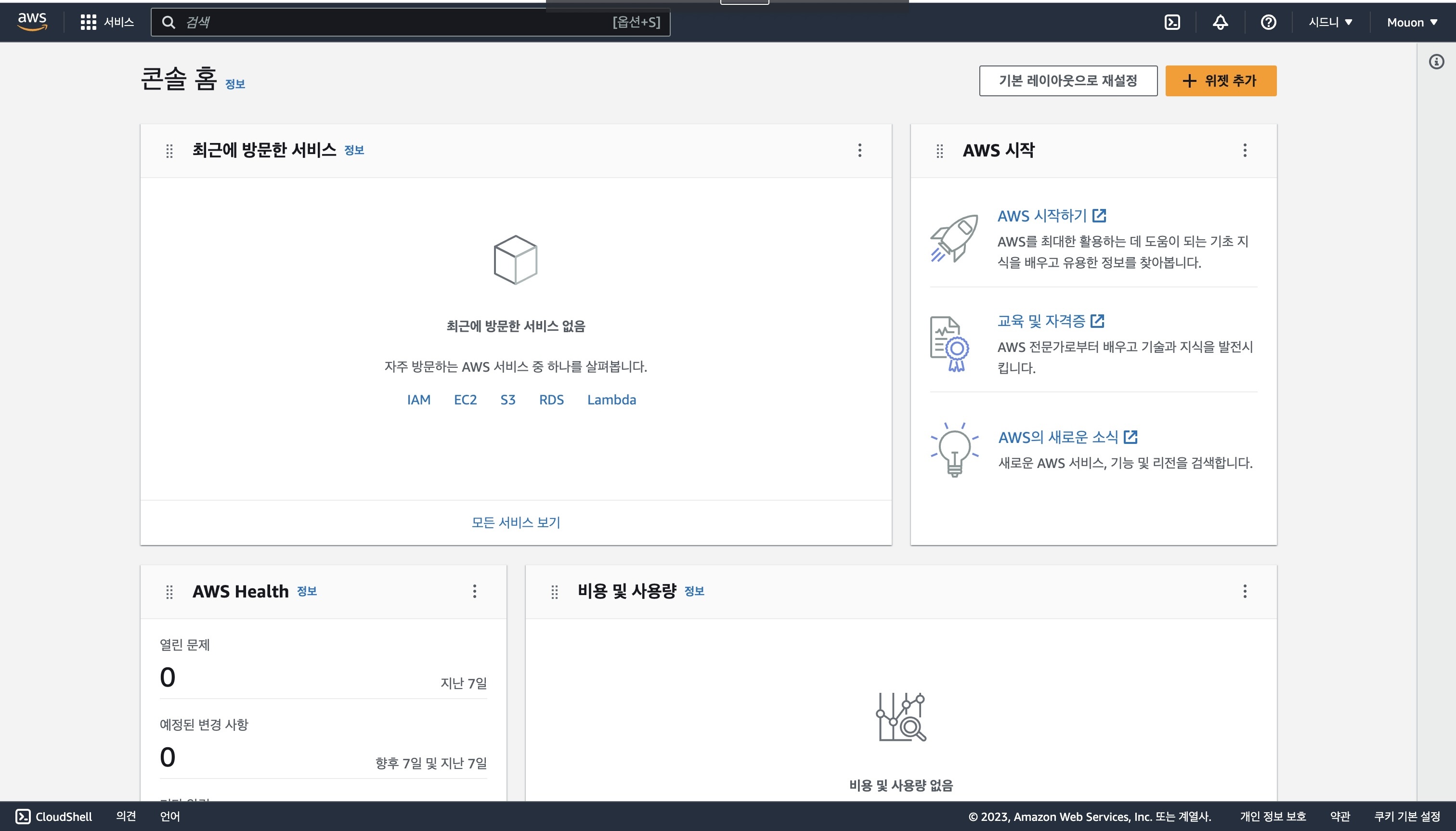 계정 생성이 완료된후 콘솔 로그인을 통해 로그인을 하면 아래와 같은 화면을 볼 수 있다.