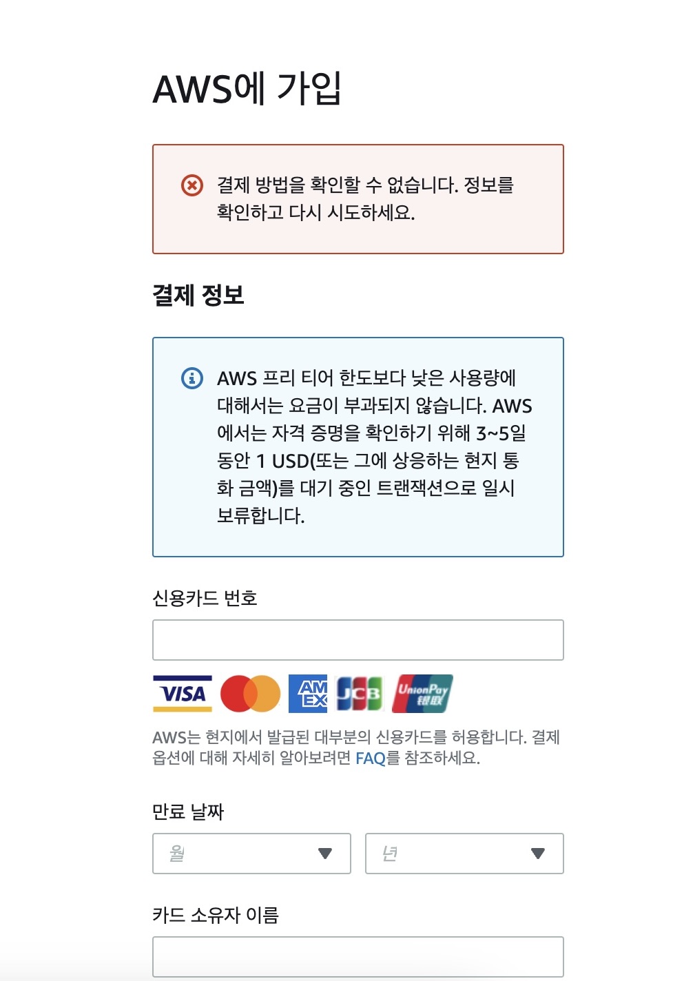 12개월이 지나면 서비스별로 무료용량을 초과하는 경우에 추가 요금을 부과하기 때문에 결제정보를 반드시 입력해야 한다.