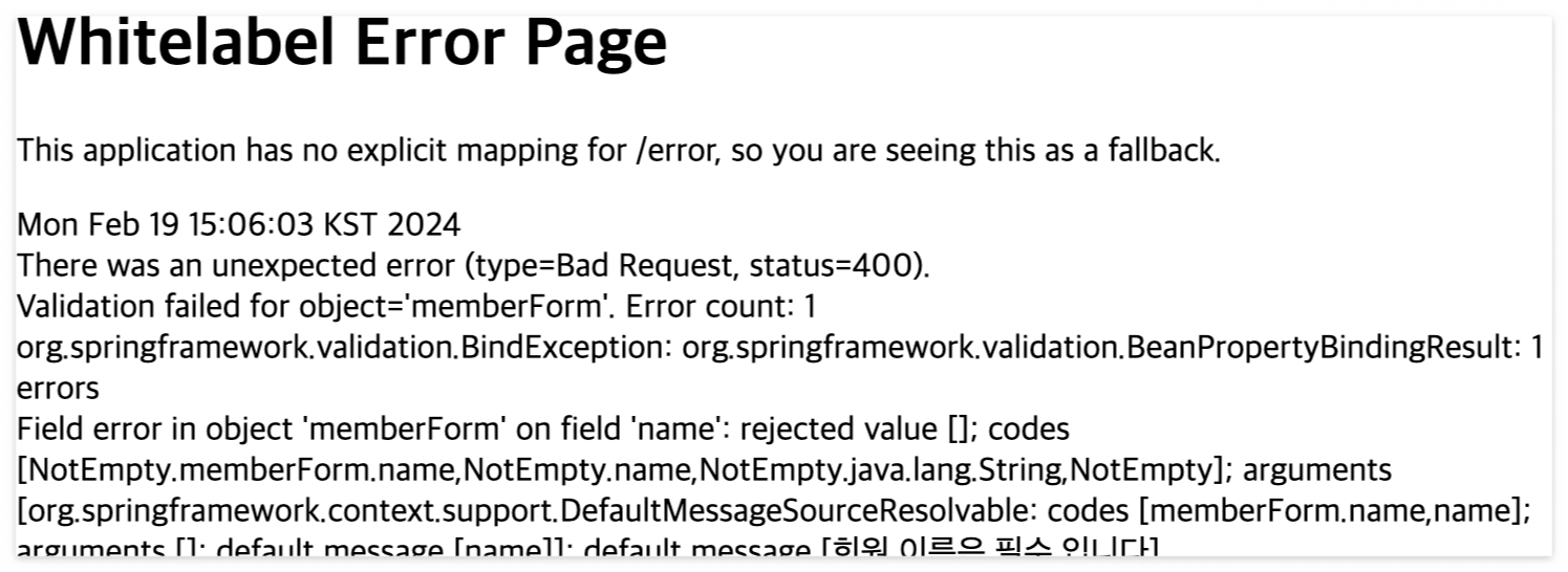 그런데 이렇게 처리하면 문제가 있습니다. 클라이언트 측에서 이름을 누락하고 값을입력하면 Spring MVC는 기본적으로 whitelabel 오류 페이지를 표시하기때문에 다음과 같이 whitelabel 페이지가 나타나서, 웹페이지의 사용성을 떨어뜨립니다.