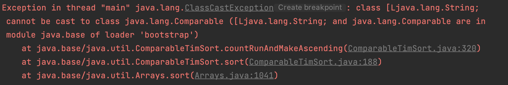 ClassCastException 예외가 발생하는 이유는 Arrays.sort 메소드가 2차원 배열을 위한 Comparable 인터페이스를 구현하지 않은 배열을 정렬하려고 하기 때문이다.
