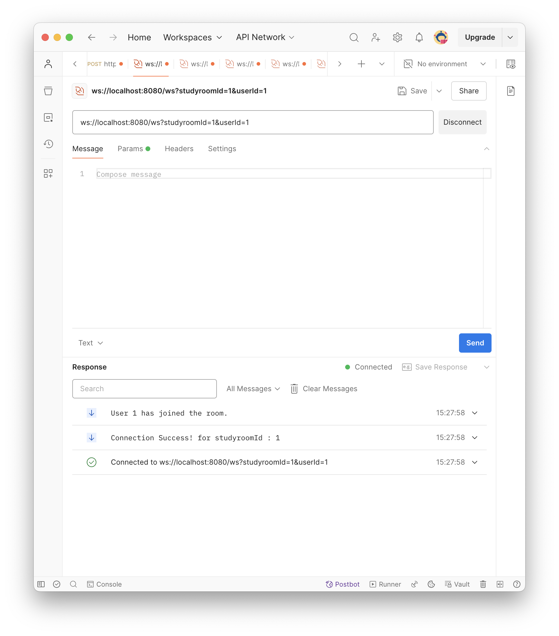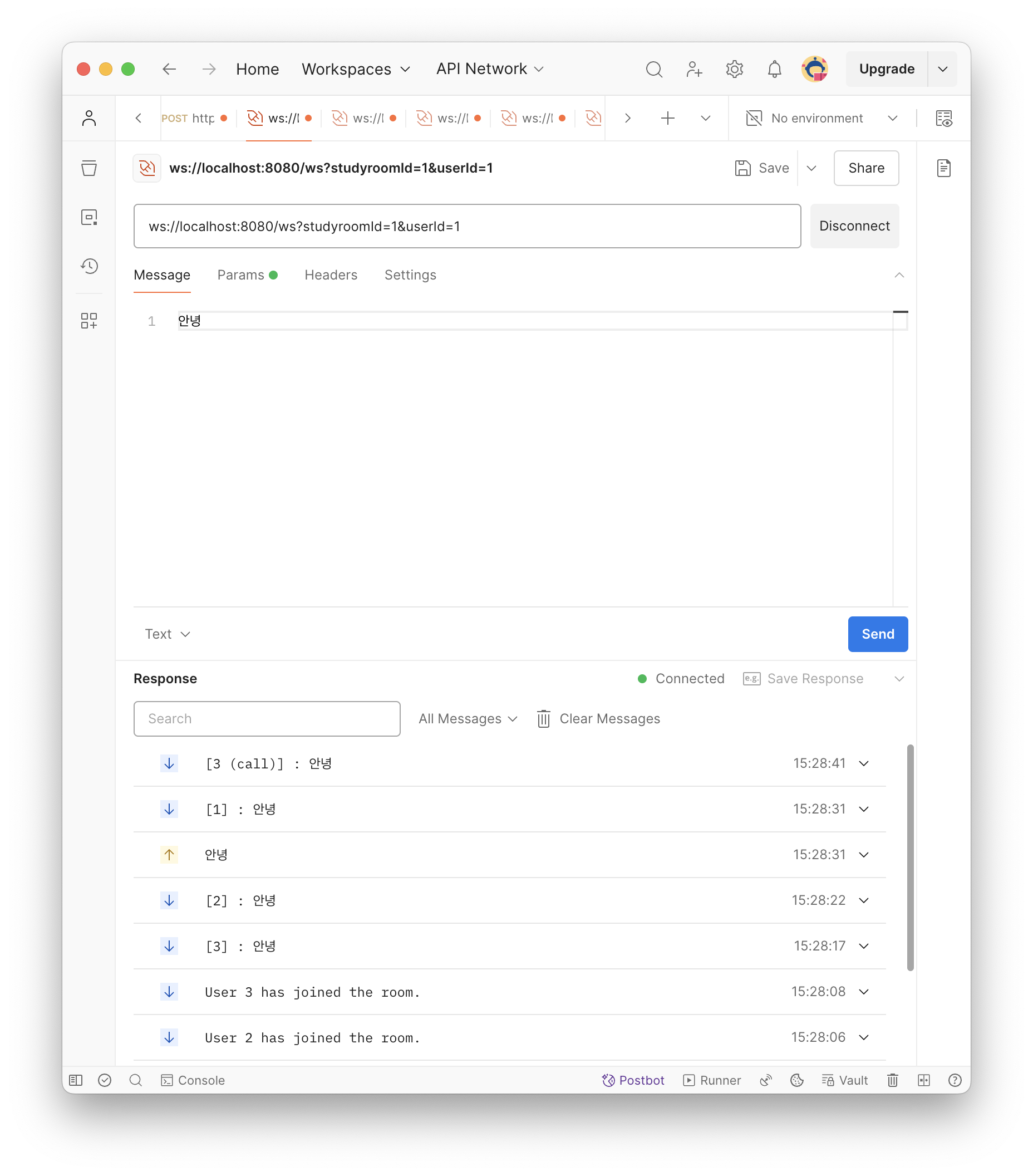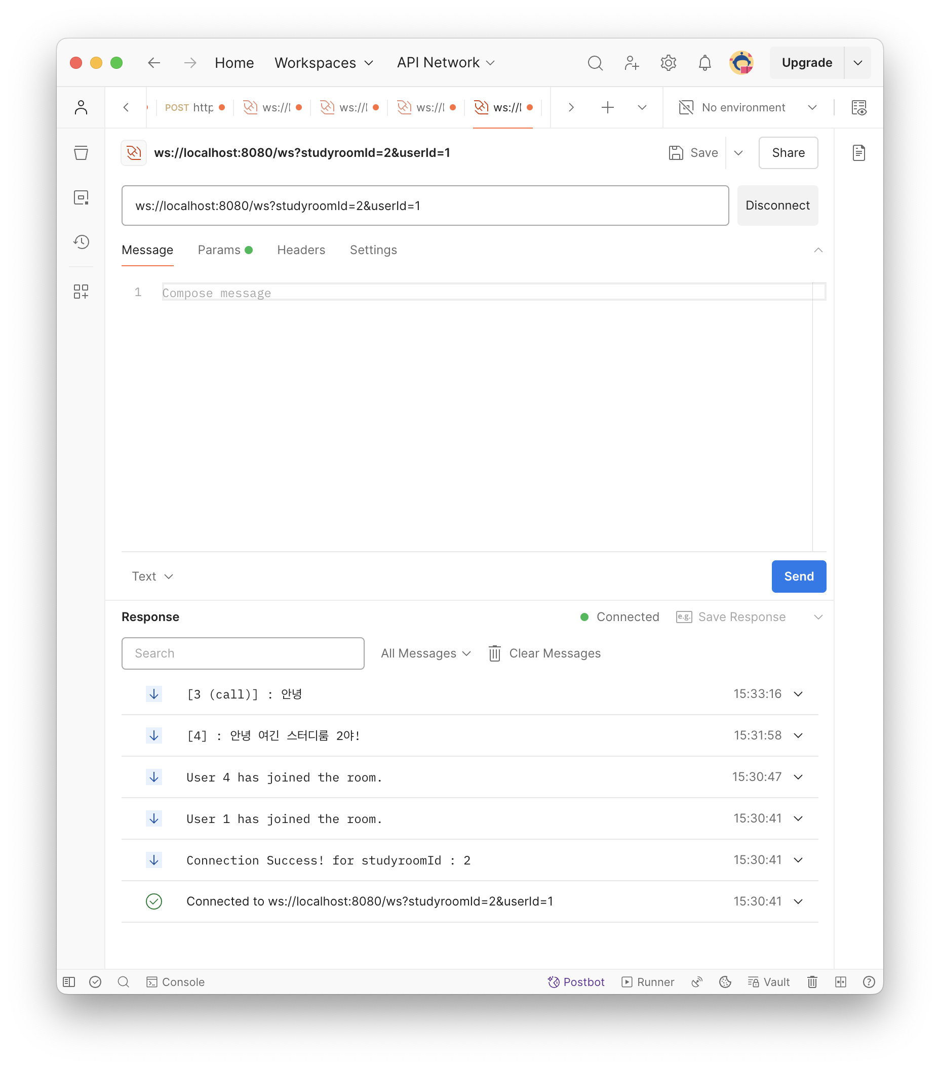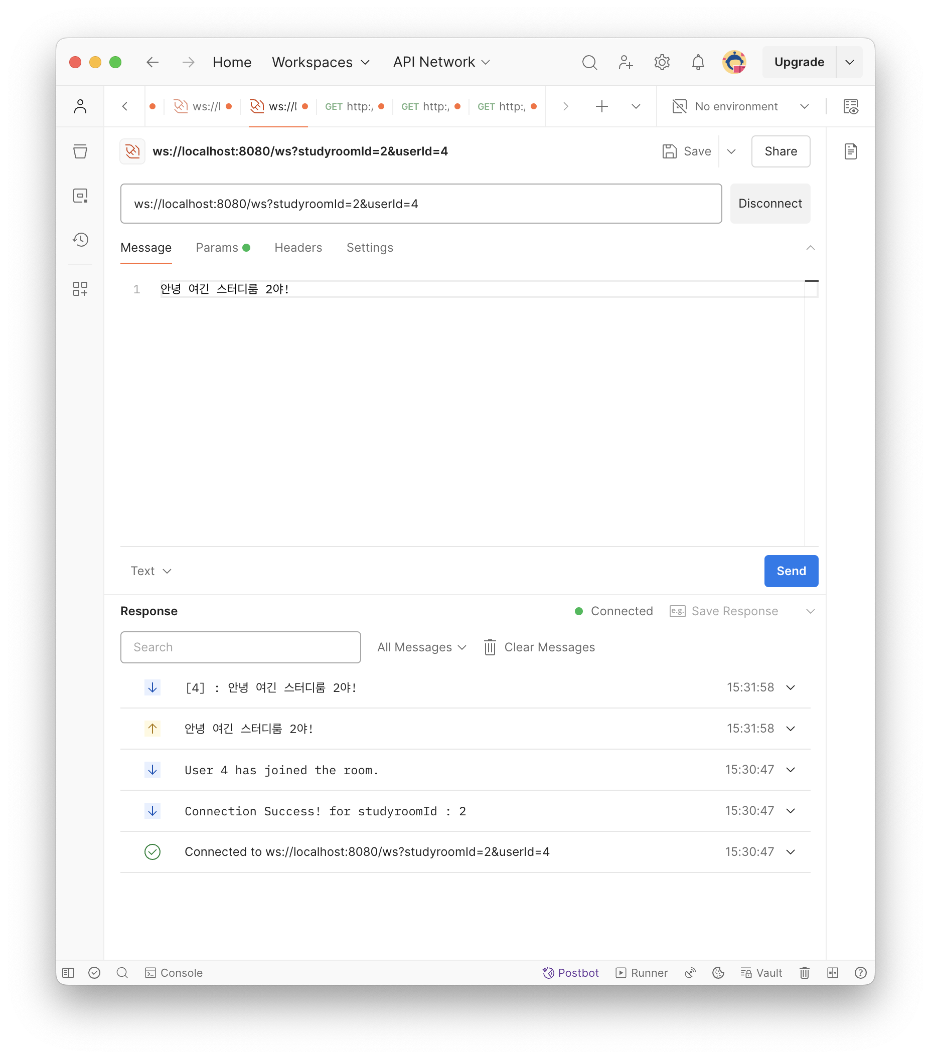 이어서 다른 맴버들이 같은 스터디룸에 입장하고 서로 메세지를 주고받을 수 있다!