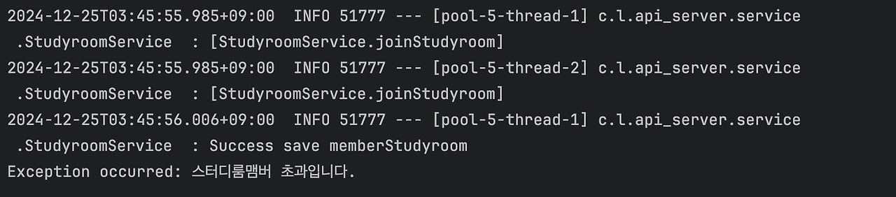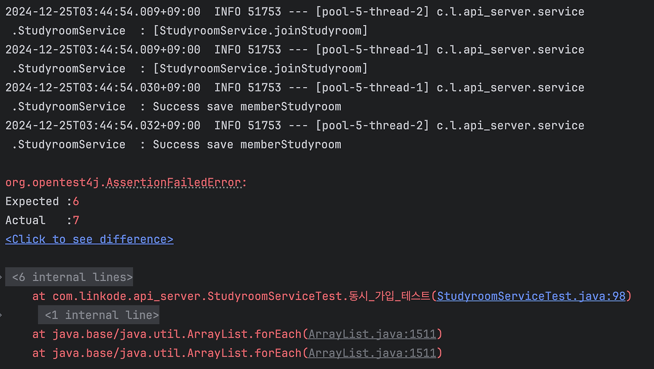 테스트 결과@Test void 동시_가입_테스트() throws Exception { // given long initialCount = 5; // 초기 멤버 수 CountDownLatch latch = new CountDownLatch(2); // when for (int i = 0; i < 2; i++) { executorService.submit(() -> { try { studyroomService.joinStudyroom(joinStudyroomRequest); } finally { latch.countDown(); } }); } latch.await(); // then long finalCount = memberstudyroomRepository .countByStudyroomAndStatus(studyroom, BaseStatus.ACTIVE); assertEquals(initialCount + 1, finalCount); // 실패! }