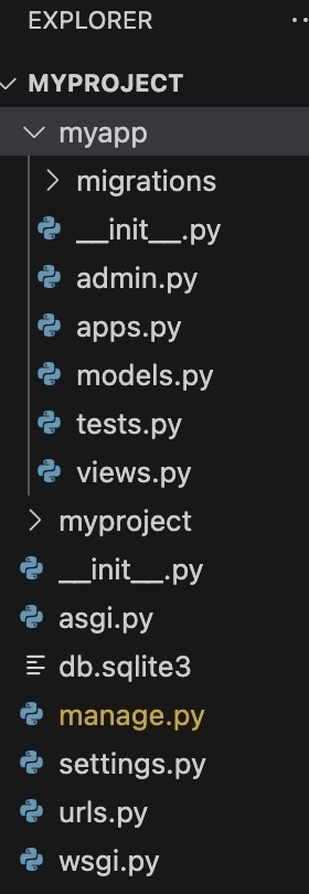 django-admin startapp myapp이 명령어를 입력하게 되면, myapp이라는 폴더가 생기고 그 안에 여러가지 파일이 생성된것을 확인할 수 있습니다.