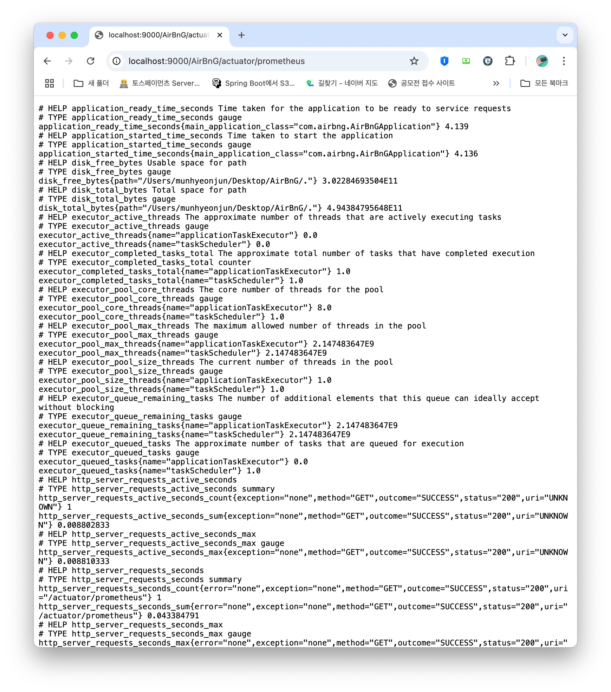 management: endpoints: web: exposure: include: "*"/actuator/prometheus 경로를 통해 메트릭 데이터를 확인할 수 있다.