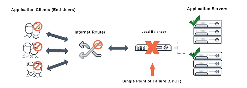 즉, 한 곳이 정지하면 다른 곳이 트래픽을 넘겨받지 못한다.이를 흔히 Single Point of Failure(SPOF) 라 부른다.